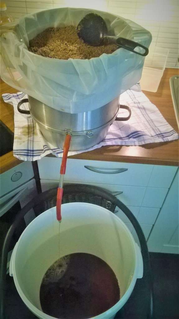 For 5–6 l of sahti, you will need approximately 3 kg sahti malt, which is basically pilsner malt mixed with a hint of darker malt. You can replace approximately 5–10% of the total grain bill with malted rye, or as I did, with 100 g of malt extract which largely consists of rye. Juniper twigs and berries can also be used.
